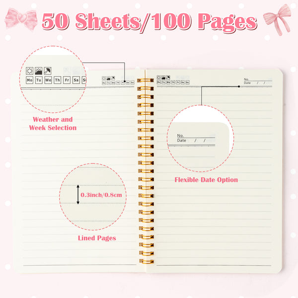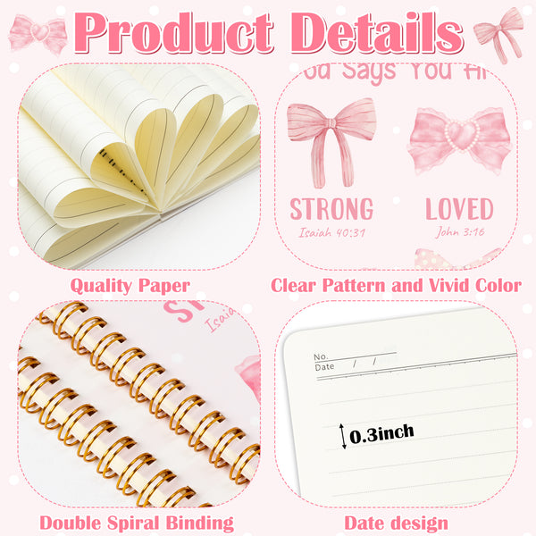 - Pink Bow Spiral Notebook: You will get 2 pack coquette spiral notebooks in different designs, and the notebook is 50 sheets and 8.3 x 5.5 inches. The cover designed with pink bow and bible verses, which is visually appealing notebooks